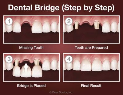 A bridge replaces missing teeth with artificial teeth and literally “bridges” the gap where one or more teeth used to be, attaching to surrounding teeth for support.